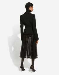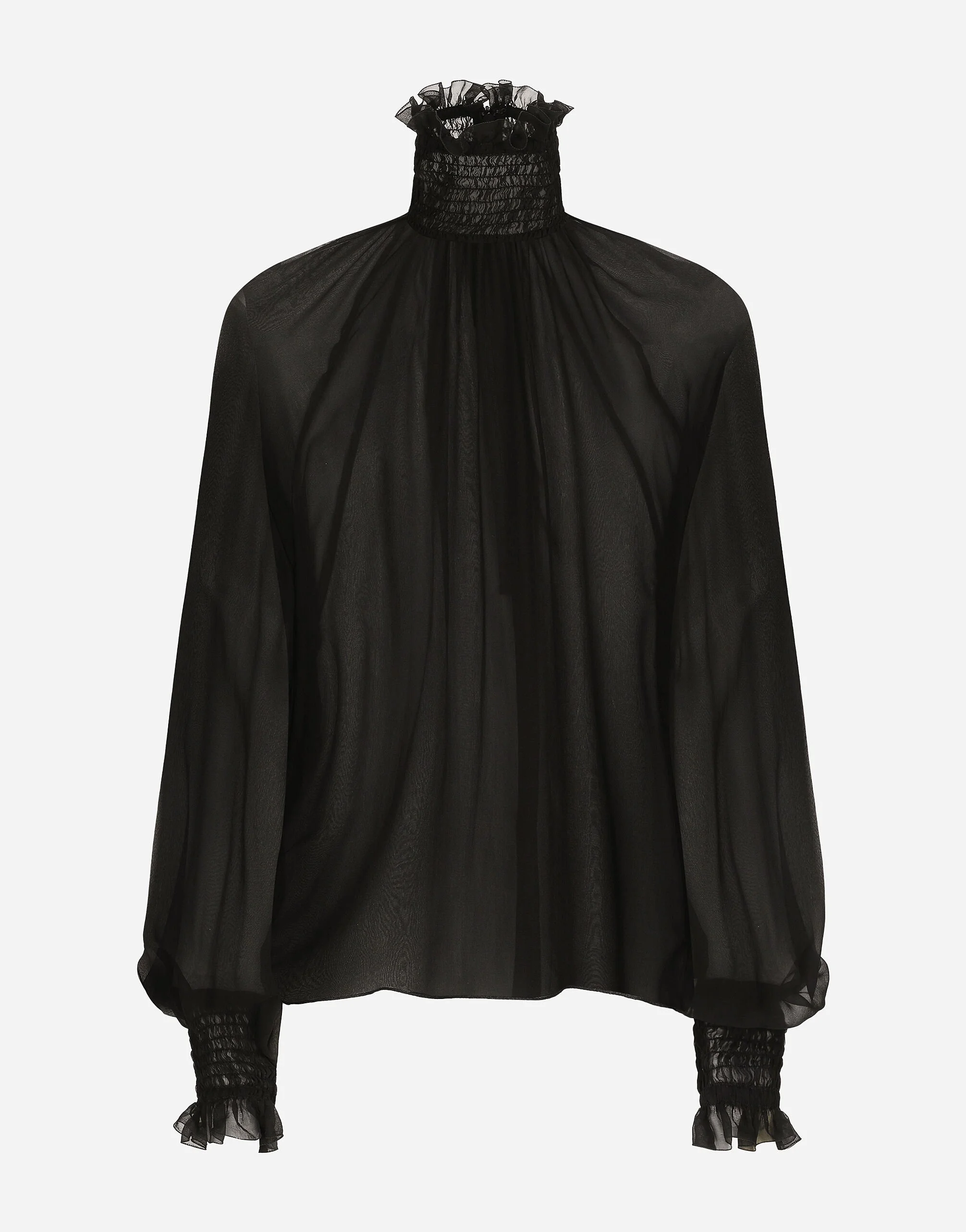 In the “WOMAN SS 24” Collection, the imagery of old Sicily interacts with the masculine, with sensual shapes, lace, nude tones and delicate overlays, to create pieces that move amid clean silhouettes, the elegance of the 1960s, the contrasts of black and white and luxurious textures. The designers are reworking their signature style and their iconic Sicilia black color to convey an aware, seductive and confident Sicilian WOMAN who is imbued with sensuality. Chiffon blouse with smock-stitch detailing: • Black • High neck with smock stitching • Long raglan sleeves with smock-stitched cuffs • Regular fit • Unlined • Small press-stud fastenings on the back of the neck • The piece measures 60 cm from the center back on a size IT 40 • The model is 175 cm tall and wears a size IT 40 • Made in Italy External composition: 100% Silk