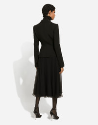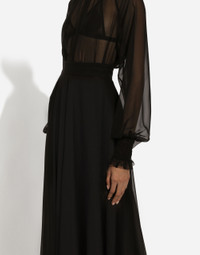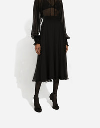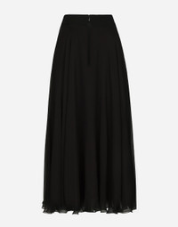 In the “WOMAN SS 24” Collection, the imagery of old Sicily interacts with the masculine, with sensual shapes, lace, nude tones and delicate overlays, to create pieces that move amid clean silhouettes, the elegance of the 1960s, the contrasts of black and white and luxurious textures. The designers are reworking their signature style and their iconic Sicilia black color to convey an aware, seductive and confident Sicilian WOMAN who is imbued with sensuality. Silk chiffon calf-length circle skirt: • Black • High-waisted • Stretch silk crepe de chine underskirt • Rear zipper and hook-and-eye fastening • The piece measures 80 cm from the waist down on a size IT 40 • The model is 175 cm tall and wears a size IT 40 • Made in Italy External composition: 100% Silk Internal composition: 91% Silk 09% Spandex
