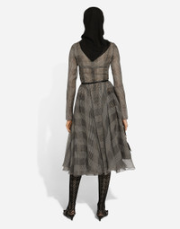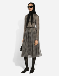 Inspired by 80s fashion photography, the Black Sicily collection masterfully blends masculine and feminine elements, pairing tailored cuts and corset details for the FW 24/25 season. A new vision of the iconic Nero Sicilia black is conveyed through contemporary and sensual looks: jackets and skirts in all-over glen plaid pair with openwork socks, while the 50s-inspired Mun shoes with Eva heel go with the houndstooth Sicily bag featuring crocodile-print leather inserts. Silk chiffon calf-length circle skirt with glen plaid print: • Gray • Round neck • Long sleeves • Stretch silk crepe de chine slip dress • Rear zipper and hook-and-eye fastening • The piece measures 75 cm from the waist down on a size IT 40 • The model is 175 cm tall and wears a size IT 40 • Made in Italy External composition: 100% Silk Internal composition: 91% Silk 9% Spandex