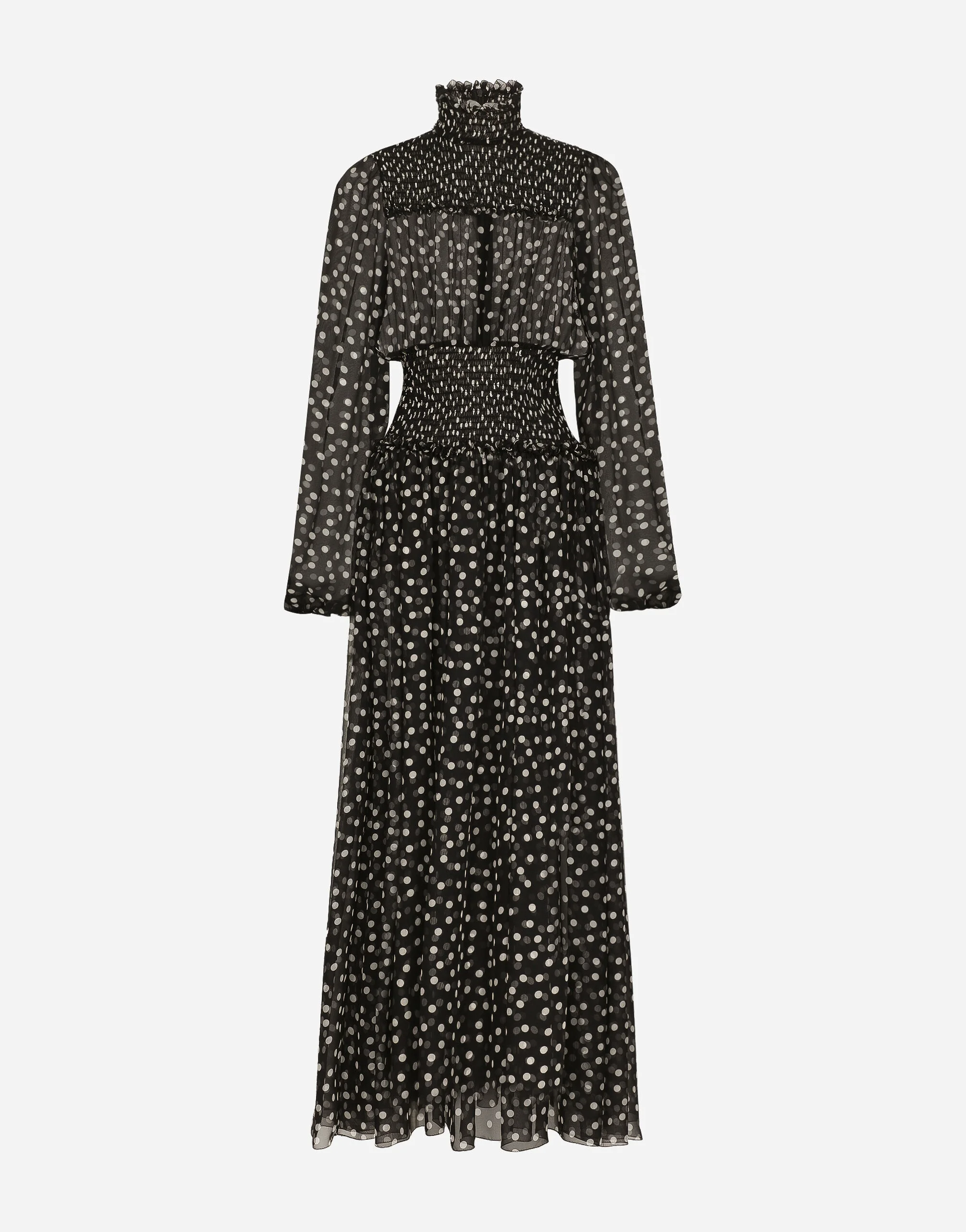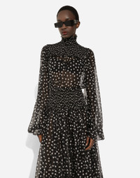 In the Black Sicily Collection, black, the absolute protagonist, becomes sensual black, sheer black, Dolce&Gabbana black. The key concept is “Black on Black”. Playing around with proportions, volumes, layered fabrics and sheer details, this style becomes absolute, bold and sexy. Unique and unmistakable, it is conveyed through the contrasts between glossy and matte fabrics, lines, volumes and special details, thereby expressing a woman’s various personalities and the true identity of Dolce&Gabbana. Silk chiffon midi dress with smock stitching and micro-polka dot print: • Black • High stretch smock-stitch neck • Long sleeves with elasticated cuffs • Stretch silk crepe de chine slip dress • Invisible zipper and hook-and-eye fastening on the back • The piece measures 107 cm from the waist down on a size IT 40 • The model is 175 cm tall and wears a size IT 40 • Made in Italy External composition: 100% Silk Internal composition: 91% Silk 9% Spandex