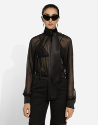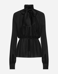 Inspired by 80s fashion photography, the Black Sicily collection masterfully blends masculine and feminine elements, pairing tailored cuts and corset details for the FW 24/25 season. A new vision of the iconic Nero Sicilia black is conveyed through contemporary and sensual looks: jackets and skirts in all-over glen plaid pair with openwork socks, while the 50s-inspired Mun shoes with Eva heel go with the houndstooth Sicily bag featuring crocodile-print leather inserts. Silk chiffon pussy-bow blouse: • Black • High pussy-bow neck • Long sleeves • Shirt-style cuffs • Stretch waistband • Unlined • Zipper fastening at the back • The piece measures 71.2 cm from the center back on a size IT 40 • The model is 175 cm tall and wears a size IT 40 • Made in Italy External composition: 98% Silk 2% Polyester