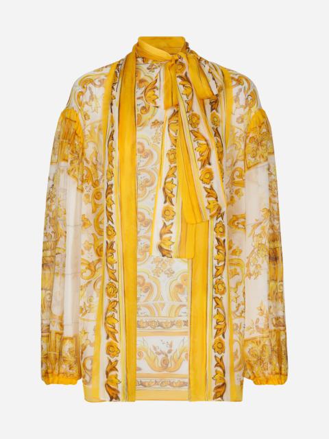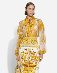 The Majolica, a symbol of Italian craftsmanship, comes in lemon yellow for the FW24/25 Girl’s Collection. This vibrant hue, brightened up by pure white, evokes summer light dancing on the quintessential Sicilian homes that look out to the sea. Evocative color detailing that adds a bold edge to iconic accessories and pieces that are extraordinarily feminine and vibrant. A tribute to the majolica art that, once again, enhances Dolce&Gabbana aesthetic rules. Silk chiffon pussy-bow shirt with majolica print: • White and Yellow • Pussy-bow collar • Long sleeves with stretch cuffs • Loose fit • Open front • The piece measures 73 cm from the center back on a size IT 40 • The model is 175 cm tall and wears a size IT 40 • Made in Italy External composition: 100% Silk