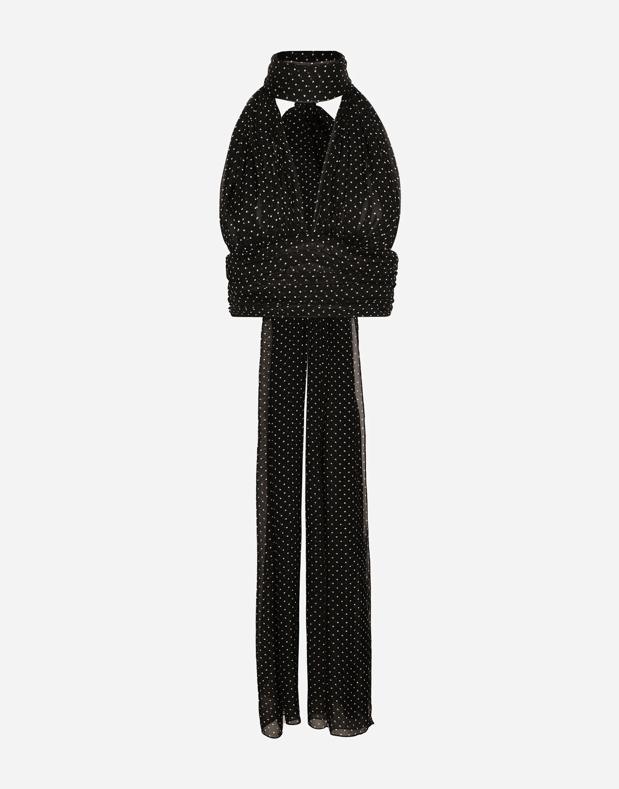 In the “WOMAN SS 24” Collection, the imagery of old Sicily interacts with the masculine, with sensual shapes, lace, nude tones and delicate overlays, to create pieces that move amid clean silhouettes, the elegance of the 1960s, the contrasts of black and white and luxurious textures. The designers are reworking their signature style and their iconic Sicilia black color to convey an aware, seductive and confident Sicilian WOMAN who is imbued with sensuality. Silk chiffon top with polka-dot print and scarf detail: • Black • V-neck with pussy-bow detail • Sleeveless • Smock stitch on the back • Unlined • Zipper fastening at the back • The model is 175 cm tall and wears a size IT 40 • Made in Italy External composition: 100% Silk