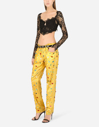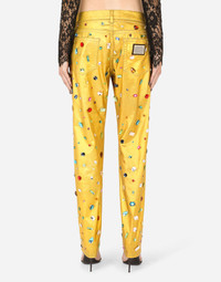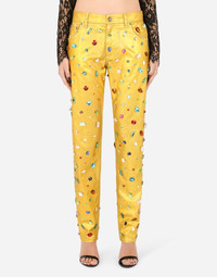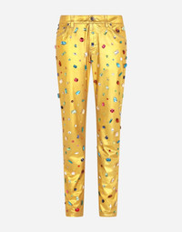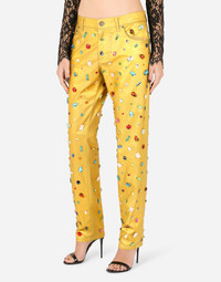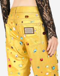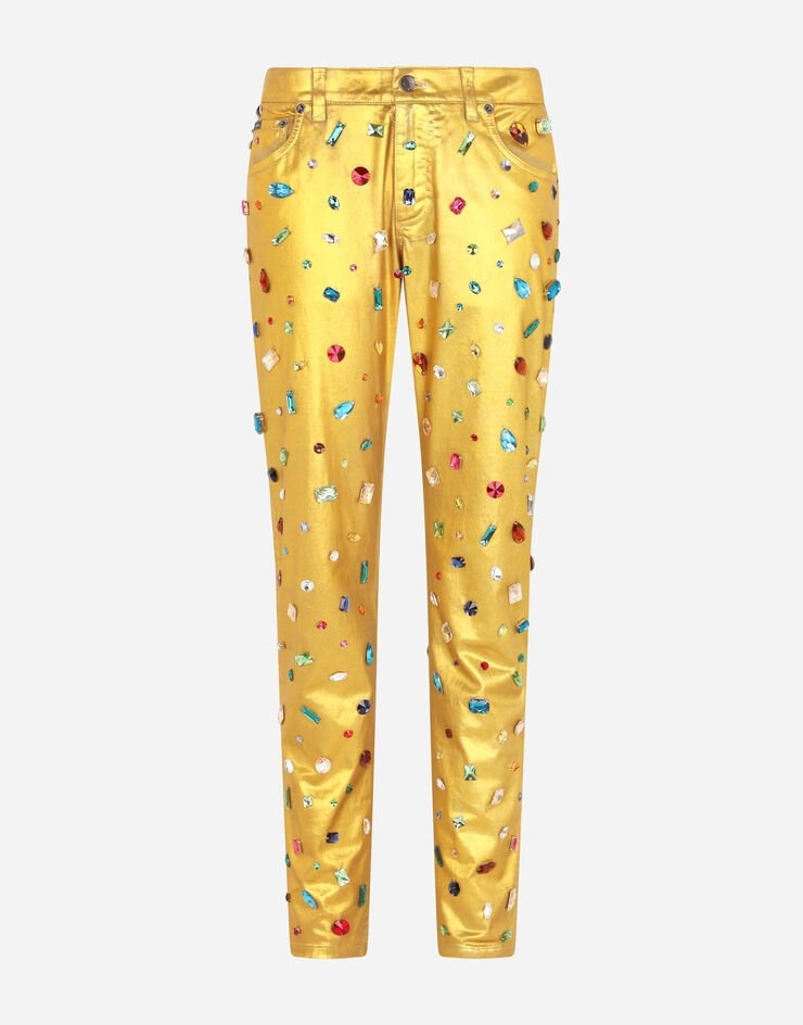 In this collection Dolce&Gabbana is rewriting the rules of fashion, women and modernity and infusing it with joy and optimism, creatively merging textures, colors and styles in a modern way and drawing inspiration from the 2000s. The result is an evocative journey back to the roots of the brand’s signature aesthetic, creating unique and fine garments with a modern feel, such as these coated denim jeans with colorful all-over rhinestone embellishment: • Regular rise • 5 pockets • Branded label on the coin pocket • Branded metal and leather plate • Inner leg: 81 cm • Hem: 17 cm • Metal button with logo and zipper • The model is 175 cm tall and wears a size IT 40 • Made in Italy Care And Details External composition: 96% Cotton 4% Spandex
