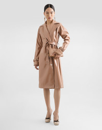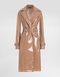 The Spring/Summer 2025 Women’s Collection is celebrating Italian beauty through bold and charismatic femininity. The 50s-inspired lingerie is the star, intermingling with fitted dresses, corsets and oversize trench coats. The iconic jackets have been updated with cropped cuts and modern inserts, while the floral prints add a romantic edge. The eveningwear shines with light fabrics and crystals, accompanied by look-defining accessories, from iconic bags to the cross earrings. Coated faux leather trench coat: • Beige • Notched lapels • Long sleeves • Pockets • Stretch silk crepe de chine lining • Belt fastening • The piece measures 109 cm from the center back on a size IT 40 • The model is 175 cm tall and wears a size IT 40 • Made in Italy External composition: 56% Polyurethane 44% Polyester Internal composition: 91% Silk 09% Spandex