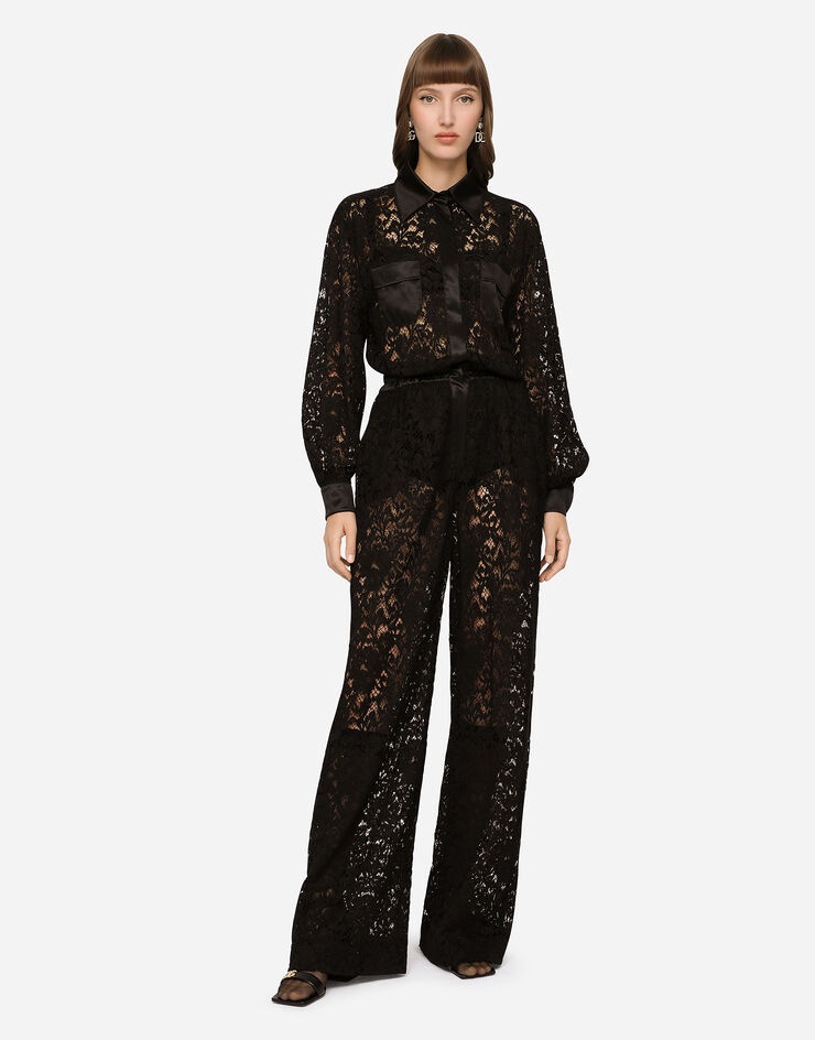 Cordonetto lace jumpsuit: • Silk satin shirt collar • Long sleeved with silk satin cuff • Silk satin waist with elastic • Stretch silk crepe de chine shorts • Inner leg: 84.5 cm • Hem: 31.5 cm • Covered placket and button fastenings with branded bottom edge • The model is 175 cm tall and wears a size IT 40 • Made in Italy Care And Details External composition: 42% Cotton 39% Viscose 10% Silk 9% Polyamide Internal composition: 73% Silk 20% Polyamide 7% Spandex