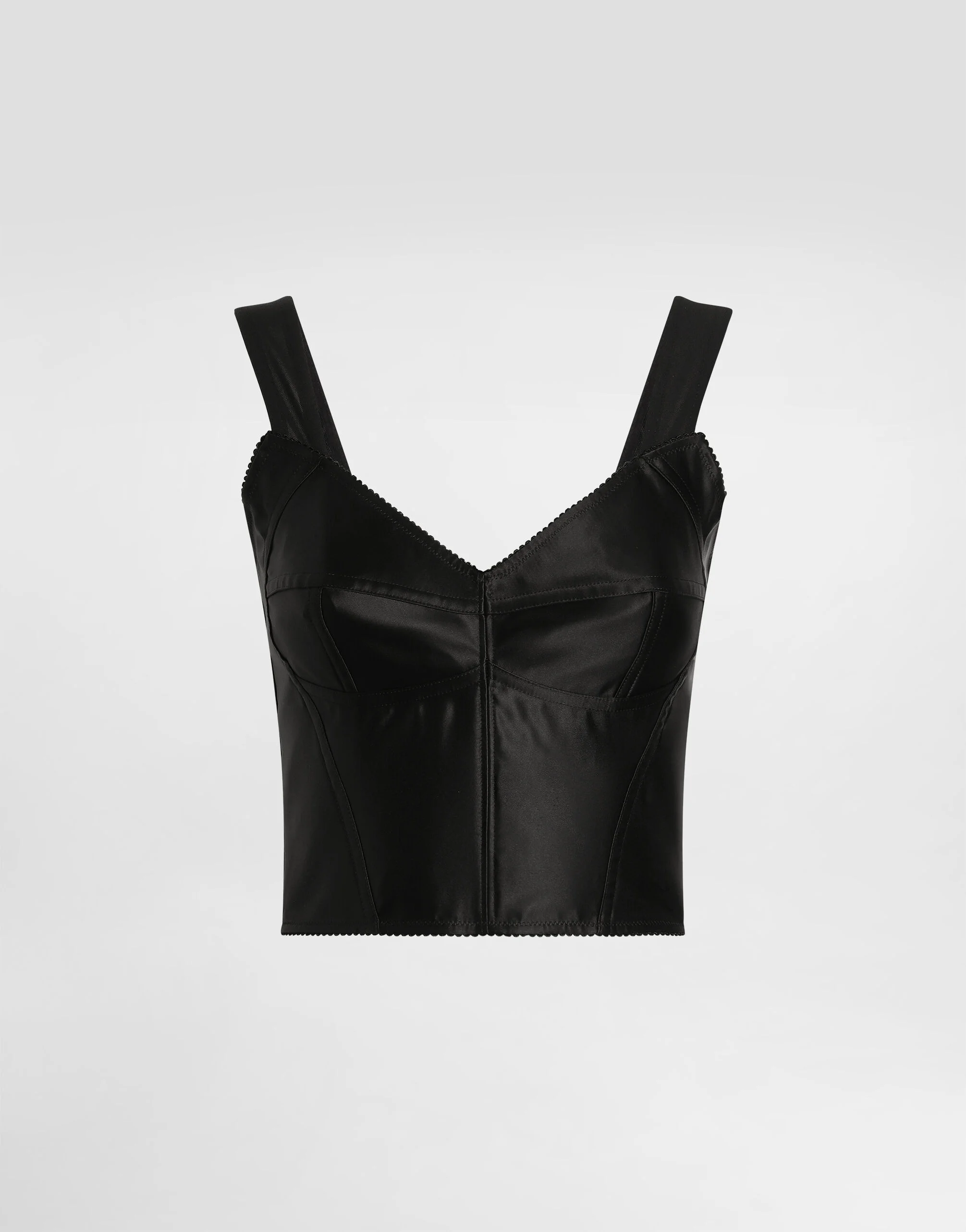 This classic corsetry bustier is an essential piece for any women's wardrobe, offering a perfect mix of elegance and comfort thanks to its satin workmanship and elastic details. Elastic satin top: • Black • Classic corsetry corset in doubled satin • Back switchboard and elastic shoulder strap with visible zip on the back • Length from shoulder point 18 cm on size 40 IT • The model is 175 cm tall and wears size 40 IT • Made in Italy External Composition: 70% Polyester, 25% Polyamide, 5% Elastane Internal Composition: 100% Cotton