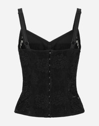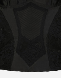 Inspired by 80s fashion photography, the Black Sicily collection masterfully blends masculine and feminine elements, pairing tailored cuts and corset details for the FW 24/25 season. A new vision of the iconic Nero Sicilia black is conveyed through contemporary and sensual looks: jackets and skirts in all-over glen plaid pair with openwork socks, while the 50s-inspired Mun shoes with Eva heel go with the houndstooth Sicily bag featuring crocodile-print leather inserts. Corset lace and satin top: • Black • Sweetheart neckline • Sleeveless with adjustable shoulder straps • Lace back • Lined • Hook-and-eye fastenings on the back • The piece measures 26 cm from the center back on a size IT 40 • The model is 175 cm tall and wears a size IT 40 • Made in Italy External composition: 60% Polyamide 30% Polyester 10% Spandex Internal composition: 70% Polyamide 28% Silk 2% Spandex