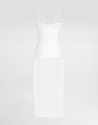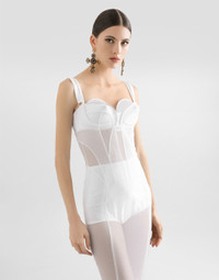 The Spring/Summer 2025 Women’s Collection is celebrating Italian beauty through bold and charismatic femininity. The 50s-inspired lingerie is the star, intermingling with fitted dresses, corsets and oversize trench coats. The iconic jackets have been updated with cropped cuts and modern inserts, while the floral prints add a romantic edge. The eveningwear shines with light fabrics and crystals, accompanied by look-defining accessories, from iconic bags to the cross earrings. Tulle calf-length dress with corset details: • White • Sweetheart neckline • Boned bodice • Lined underwired cups • Sleeveless with adjustable stretch straps • Stretch silk satin lining • Rear zipper and hook-and-eye fastening • The piece measures 75 cm from the waist down on a size IT 40 • The model is 175 cm tall and wears a size IT 40 • Made in Italy External composition: 83% Polyamide 9% Silk 8% Spandex Internal composition: 94% Silk 6% Spandex