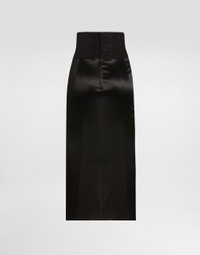The Spring/Summer 2025 Women’s Collection is celebrating Italian beauty through bold and charismatic femininity. The 50s-inspired lingerie is the star, intermingling with fitted dresses, corsets and oversize trench coats. The iconic jackets have been updated with cropped cuts and modern inserts, while the floral prints add a romantic edge. The eveningwear shines with light fabrics and crystals, accompanied by look-defining accessories, from iconic bags to the cross earrings. Stretch satin calf-length skirt with corset-style belt detail: • Black • High-waisted • Stretch silk satin lining • Rear zipper and hook-and-bar fastening • The piece measures 80 cm from the waist down on a size IT 40 • The model is 175 cm tall and wears a size IT 40 • Made in Italy External composition: 52% Acetate 38% Polyamide 10% Spandex Internal composition: 74% Silk 10% Polyester 8% Spandex 8% Polyamide