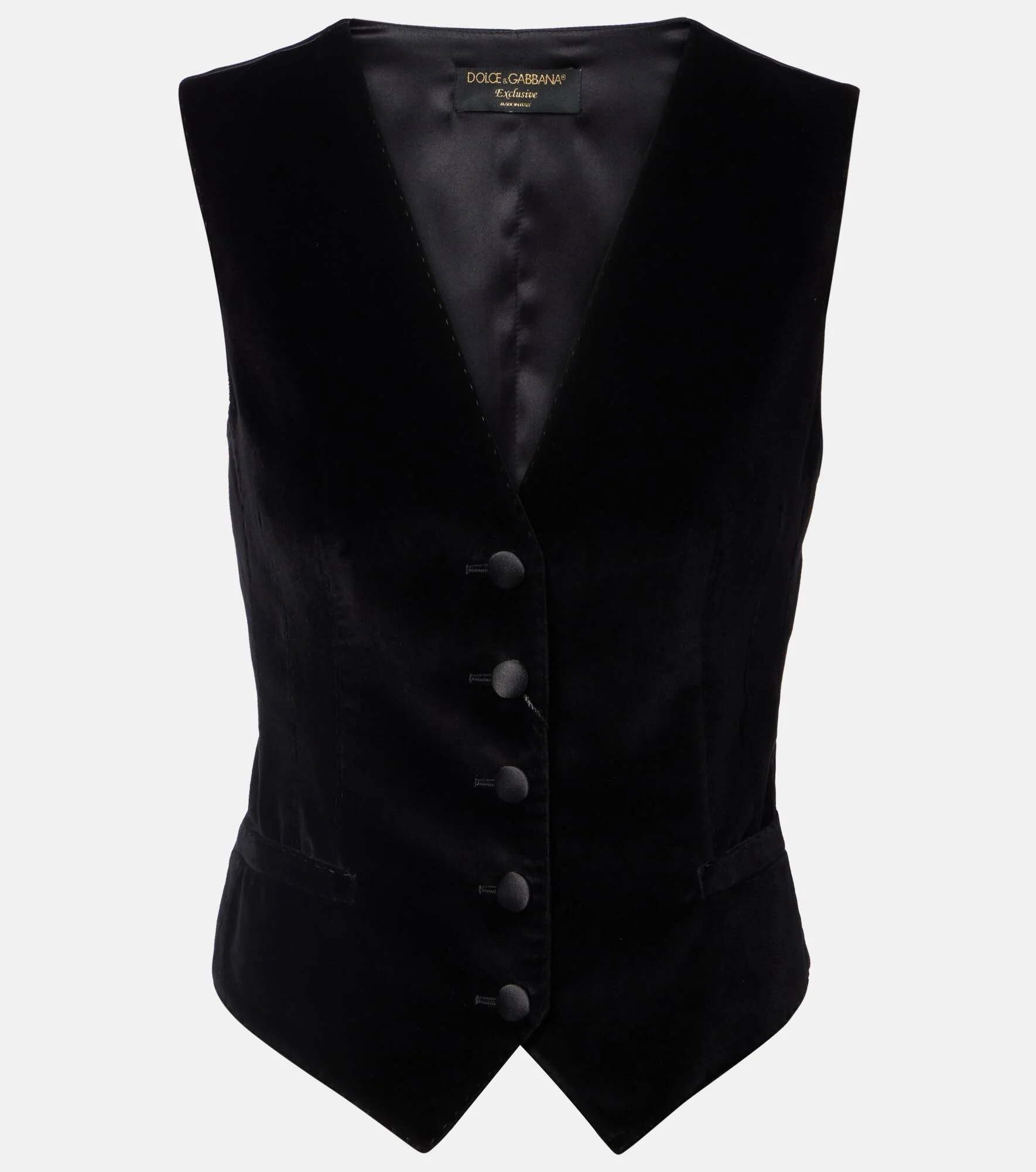 Dolce&Gabbana's applies time-honored techniques to every tailored piece, blending traditional elegance with modern style. Crafted in Italy from cotton and silk-blend velvet, this vest features satin-covered buttons. Product Details - Material: 60% cotton, 37% silk, 3% elastane - Care instructions: dry clean - Made in Italy - Designer color name: Black - Item color: black - Lining: 92% silk, 8% elastane - Pockets: welt pockets - Closure: buttoned front - Item number: P01107002 Size & Fit - True to size - Cinched waist - Non-stretchy fabric - Falls to the hip - Height of model is 174cm-68.5" and wears a size IT 40