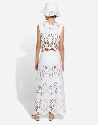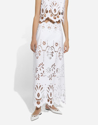 The Italian summers of the 1960s, the candid purity of white, the sophisticated elegance of the jet set of that era. The imagery of the FW24/25 Capri Collection encapsulates all this flawlessly. The pieces range from floaty poplin silhouettes or sack-style dresses and skirts, to brocade outerwear and floral-inlay fabric shirts. The iconic bags – the Logo Bag, the Sicily Bag and the Dolce Box – complement the looks, while the shoes come embroidered with designs inspired by the crystal-clear sea of Capri. Cotton poplin A-line calf-length skirt with cut-out detailing: • White • Low rise • Unlined • Rear zipper and hook-and-eye fastening • The piece measures 96 cm from the waist down on a size IT 40 • The model is 175 cm tall and wears a size IT 40 • Made in Italy External composition: 96% Cotton 04% Polyester