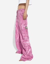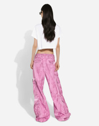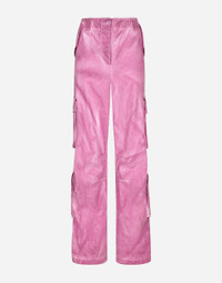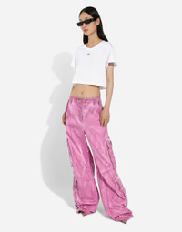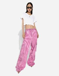 The spirit of the 1960s is taking over the new Flower Power collection. The focus is a head-to-toe floral look built around pairing and layering rose, anemone and floral bouquet maxi-prints. A cosmopolite poised between playful and sexy, this woman interprets the austerity and elegance of the 1960s, harking back to boldly opulent imagery that here at Dolce&Gabbana is condensed and reinterpreted through silhouettes, ample proportions and airy shapes, bringing femininity and sensuality to the forefront. Garment-dyed cotton drill cargo pants: • Fuchsia • Regular rise • Front and back pockets • Concealed button fastenings • Inner leg: 83 cm • Hem: 33 cm • The model is 175 cm tall and wears a size IT 40 • Made in Italy External composition: 99% Cotton 1% Spandex
