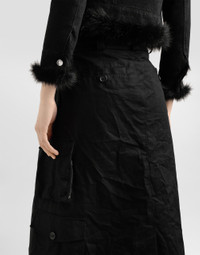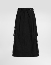 In the Fall/Winter 2025 Fashion Show Collection, shearling jackets, in fur-free versions, reveal slip dresses and create contrast' plays while denim welcomes fabric or Leo print inserts. Sweatshirts are the result of long experimentation with volumes. Evening looks become precious thanks to dresses with special embroideries and luminous touches of sequins and crystals. Sheepskin inserts also unite hats, shoes, and bags, including those with pockets. This skirt is an example of urban style and functionality, perfect for those looking for a modern and practical look. With cargo details and a trouser-inspired construction, it's the ideal garment to add a touch of originality to your wardrobe. Cotton cargo skirt: • Black • French slant pockets on the front and piped pockets on the back • Buttonhole and button closure • Gusseted pocket pattern on the sides • Covered zippered opening in the center front • 5.5 cm high belt with topstitching and drawstring passage • Skirt length including belt 75 cm on size 40 IT • The model is 175 cm tall and wears size 40 IT • Made in Italy External Composition: 100% Cotton