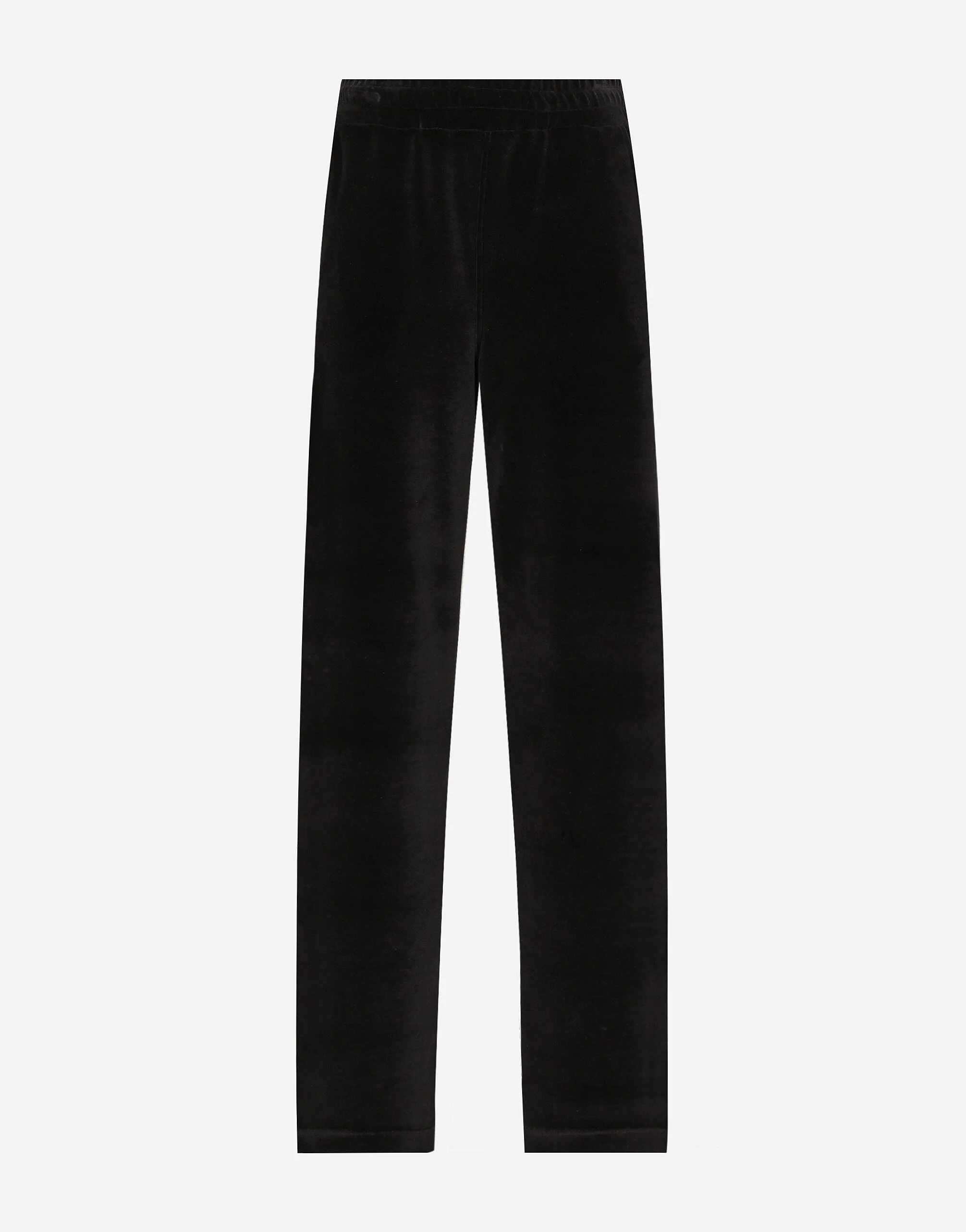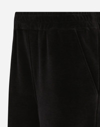 Inspired by 80s fashion photography, the Black Sicily collection masterfully blends masculine and feminine elements, pairing tailored cuts and corset details for the FW 24/25 season. A new vision of the iconic Nero Sicilia black is conveyed through contemporary and sensual looks: jackets and skirts in all-over glen plaid pair with openwork socks, while the 50s-inspired Mun shoes with Eva heel go with the houndstooth Sicily bag featuring crocodile-print leather inserts. Cotton chenille jogging pants with DG logo: • Black • High stretch waist • Front slant pockets and welt back pockets • Embroidery on the back pocket • Inner leg: 82 cm • Hem: 27 cm • The model is 175 cm tall and wears a size IT 40 • Made in Italy External composition: 85% Cotton 15% Polyamide