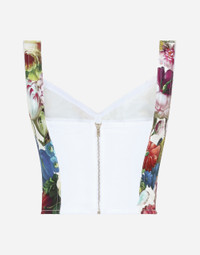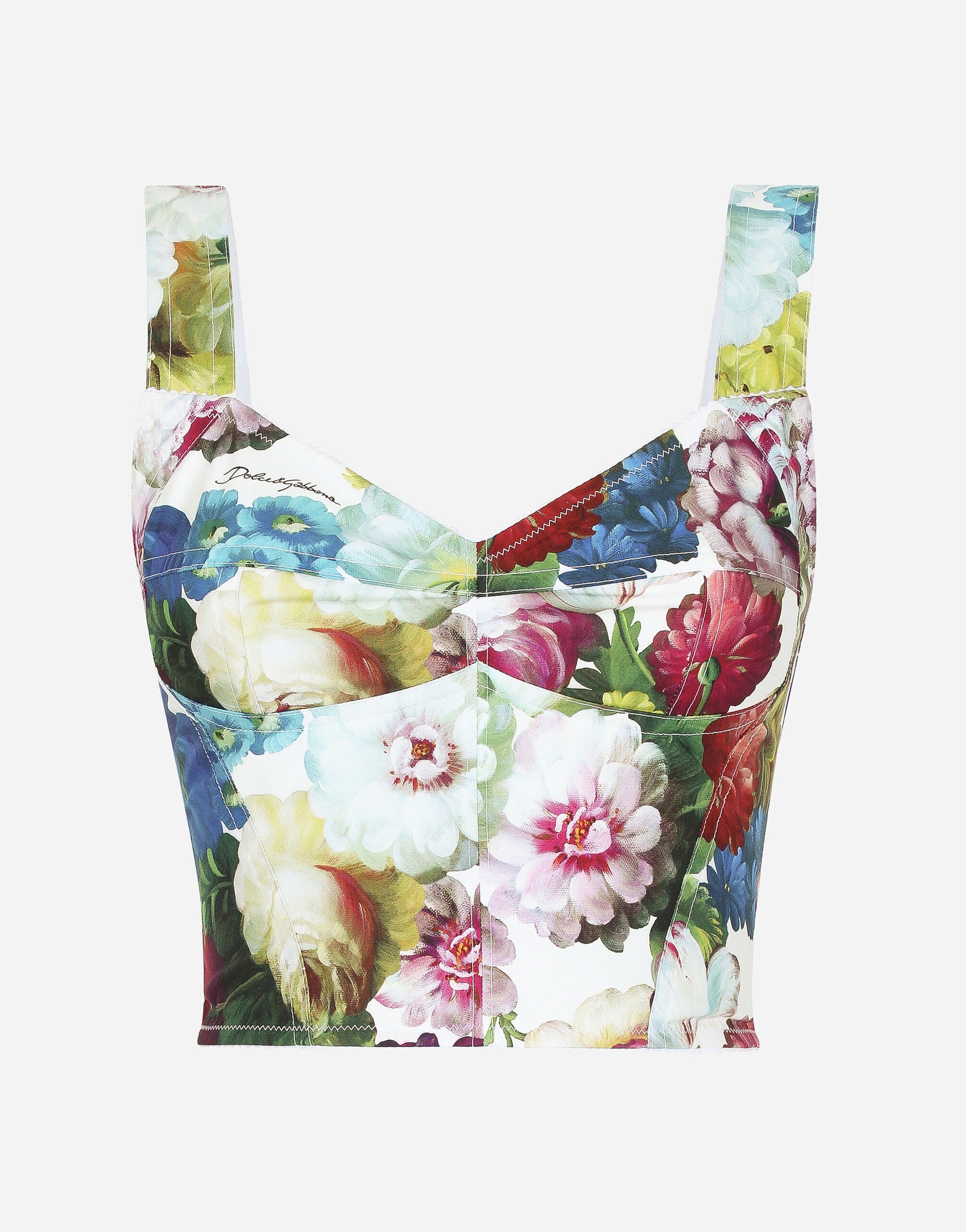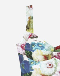The spirit of the 1960s is taking over the new Flower Power collection. The focus is a head-to-toe floral look built around pairing and layering rose, anemone and floral bouquet maxi-prints. A cosmopolite poised between playful and sexy, this women interprets the austerity and elegance of the 1960s, harking back to boldly opulent imagery that here at Dolce&Gabbana is condensed and reinterpreted through silhouettes, ample proportions and airy shapes, bringing femininity and sensuality to the forefront. Cotton poplin corset top nocturnal flower print: • Multi-colored • Sweetheart neckline • Sleeveless with shoulder straps • Lined • Elasticated marquisette on the back • Zipper and hook-and-eye fastening • The piece measures 18 cm from the center back on a size IT 40 • The model is 175 cm tall and wears a size IT 40 • Made in Italy The difference in the print placement that you may find on this product is a feature of Dolce&Gabbana’s “Handmade” pieces. A detail that makes every garment or accessory unique and exclusive. External composition: 70% Cotton 25% Polyamide 5% Spandex Internal composition: 68% Silk 22% Polyamide 10% Spandex