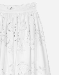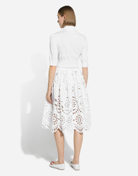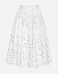 The Italian summers of the 1960s, the candid purity of white, the sophisticated elegance of the jet set of that era. The imagery of the FW24/25 Capri Collection encapsulates all this flawlessly. The pieces range from floaty poplin silhouettes or sack-style dresses and skirts, to brocade outerwear and floral-inlay fabric shirts. The iconic bags – the Logo Bag, the Sicily Bag and the Dolce Box – complement the looks, while the shoes come embroidered with designs inspired by the crystal-clear sea of Capri. Cotton poplin midi circle skirt with cut-out detailing: • White • High-waisted • Unlined • Rear zipper and hook-and-eye fastening • The piece measures 66 cm from the waist down on a size IT 40 • The model is 175 cm tall and wears a size IT 40 • Made in Italy External composition: 95% Cotton 05% Polyester