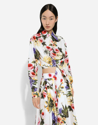 The spirit of the 1960s is taking over the new Flower Power collection. The focus is a head-to-toe floral look built around pairing and layering rose, anemone and floral bouquet maxi-prints. A cosmopolite poised between playful and sexy, this woman interprets the austerity and elegance of the 1960s, harking back to boldly opulent imagery that here at Dolce&Gabbana is condensed and reinterpreted through silhouettes, ample proportions and airy shapes, bringing femininity and sensuality to the forefront. Short garden-print cotton poplin shirt with pussy-bow: • Multi-colored • Shirt collar • Short sleeves • Cropped fit • Button fastenings with branded bottom edge • The piece measures 43 cm from the center back on a size IT 40 • The model is 175 cm tall and wears a size IT 40 • Made in Italy The difference in the print placement that you may find on this product is a feature of Dolce&Gabbana’s “Handmade” pieces. A detail that makes every garment or accessory unique and exclusive. External composition: 100% Cotton
