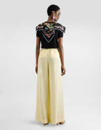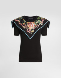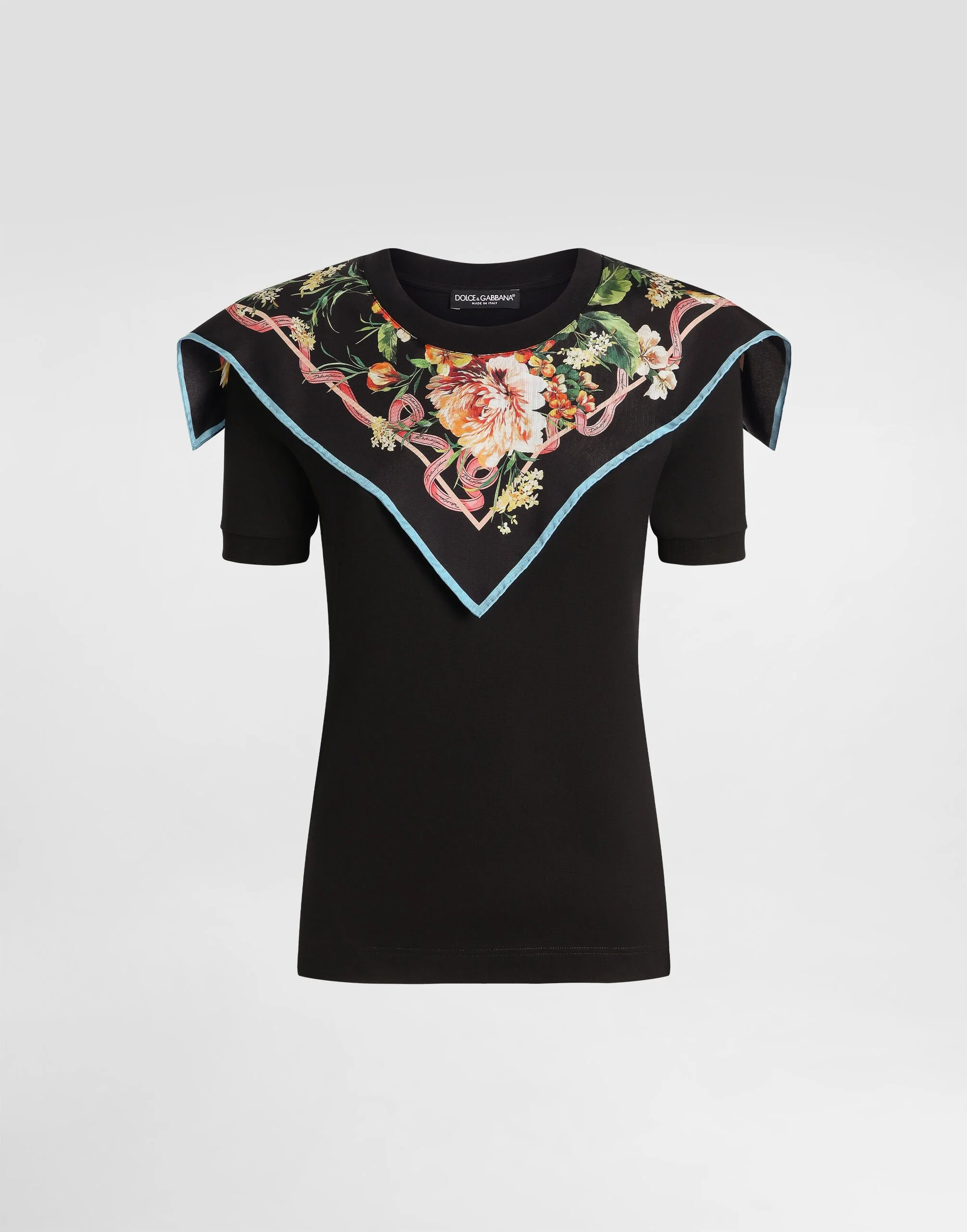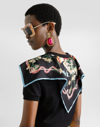 This short-sleeved t-shirt combines the simplicity of jersey with the sophistication of the silk scarf, creating a versatile and chic garment for any occasion. The contemporary design stands out for its personalized tucked neck and triangular scarf that adds a touch of elegance on both the front and back. Short-sleeved t-shirt with scarf: • Black • Customized false hem • 50x50 triangle scarf on front and back • The model is 175 cm tall and wears size 40 IT • Made in Italy External Composition: 70% Cotton, 30% Silk