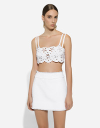 The Italian summers of the 1960s, the candid purity of white, the sophisticated elegance of the jet set of that era. The imagery of the FW24/25 Capri Collection encapsulates all this flawlessly. The pieces range from floaty poplin silhouettes or sack-style dresses and skirts, to brocade outerwear and floral-inlay fabric shirts. The iconic bags – the Logo Bag, the Sicily Bag and the Dolce Box – complement the looks, while the shoes come embroidered with designs inspired by the crystal-clear sea of Capri. Cotton poplin bralette top with cut-out detailing: • White • Straight neckline • Sleeveless with shoulder straps • Unlined • Rear zipper and hook-and-eye fastening • The model is 175 cm tall and wears a size IT 40 • Made in Italy External composition: 95% Cotton 5% Polyester