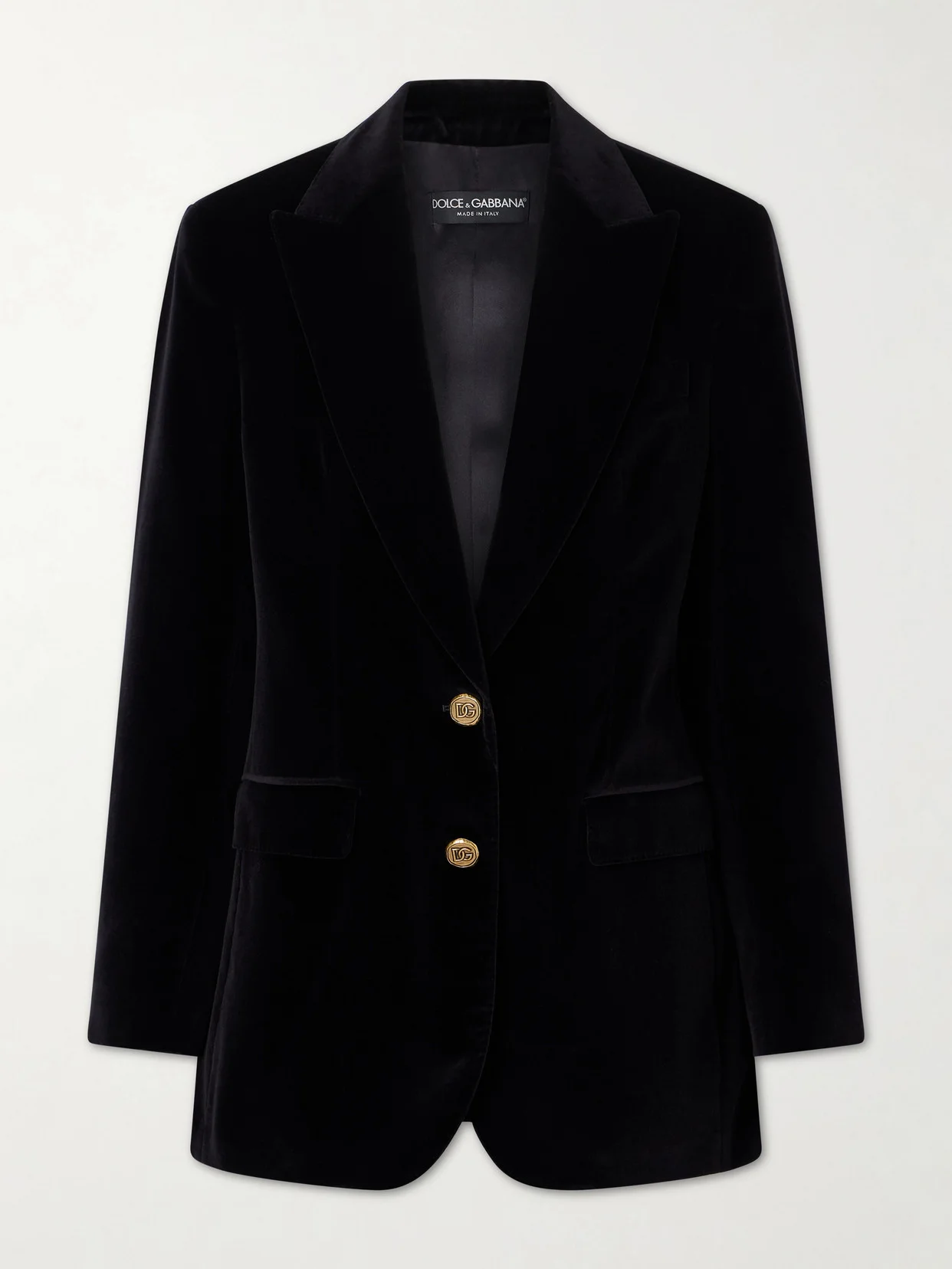 Dolce & Gabbana's blazer is both glamorous and timeless. It's been made in Italy from plush black cotton-velvet in a single-breasted profile with wide peak lapels. Wear yours with denim or tailored cigarette pants.