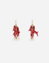 The Italian summers of the 1960s, the candid purity of white, the sophisticated elegance of the jet set of that era. The imagery of the FW24/25 Capri Collection encapsulates all this flawlessly. The pieces range from floaty poplin silhouettes or sack-style dresses and skirts, to brocade outerwear and floral-inlay fabric shirts. The iconic bags – the Logo Bag, the Sicily Bag and the Dolce Box – complement the looks, while the shoes come embroidered with designs inspired by the crystal-clear sea of Capri. Creole earrings with horn, coral branches and pearls: • Gold • Rhinestone-adorned horn • Acrylic glass spheres • Hoop fastening • Height: 6.5 cm • Nickel-free and hypoallergenic materials • Engraved logo • Made in Italy External composition: 20% Steel 30% Brass 40% Acrylic Glass 10% Glass