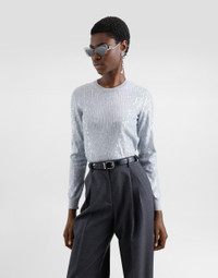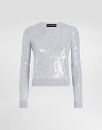 The Everyday Women's Collection reimagines contemporary daily wear with Dolce&Gabbana's signature style codes. Iconic fabrics mix with standout details like embroidered flowers, crystals, and jewel buttons, infusing elegance into every look. Gray animal print accented with green and purple, hyper-geometric jewelry, voluminous shapes and transparencies add unique touches. Men's tweed is reinvented with graphic twists, creating distinctive pieces that reflect refined sensuality. Crew-neck viscose sweater with sequin embellishment: • Gray • 18-gauge knit • Round neck • Long sleeves • French seam armholes • Dense hand • Ribbed neck and hem • Slim fit • The piece measures 53 cm from the shoulder seam on a size IT 40 • The model is 175 cm tall and wears a size IT 40 • Made in Italy External composition: 80% Viscose 20% Polyester