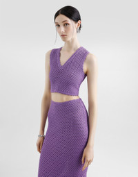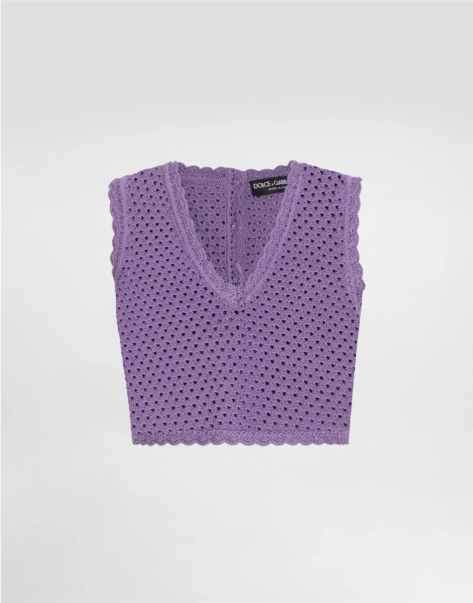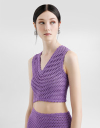 The Spring/Summer 2025 Warm Weather Collection is a vibrant ode to the beauty of the floral world, celebrating the elegance and vitality that lie at the heart of the brand’s DNA. Delicate, colorful bouquets dance across light dresses, skirts, trousers, and beachwear, infusing each piece with a sense of romance and freshness. Coordinated accessories, from scarves to headbands, add charm. An explosion of color and blooms, this collection captures the brand’s unmistakable spirit. Crochet crop top: • Purple • V-neckline • 7-gauge openwork weave • Sleeveless • Dense hand • Cropped fit • Branded button fastenings on the back • The piece measures 35 cm from the shoulder seam on a size IT 40 • The model is 175 cm tall and wears a size IT 40 • Made in Italy External composition: 88% Viscose 12% Spandex
