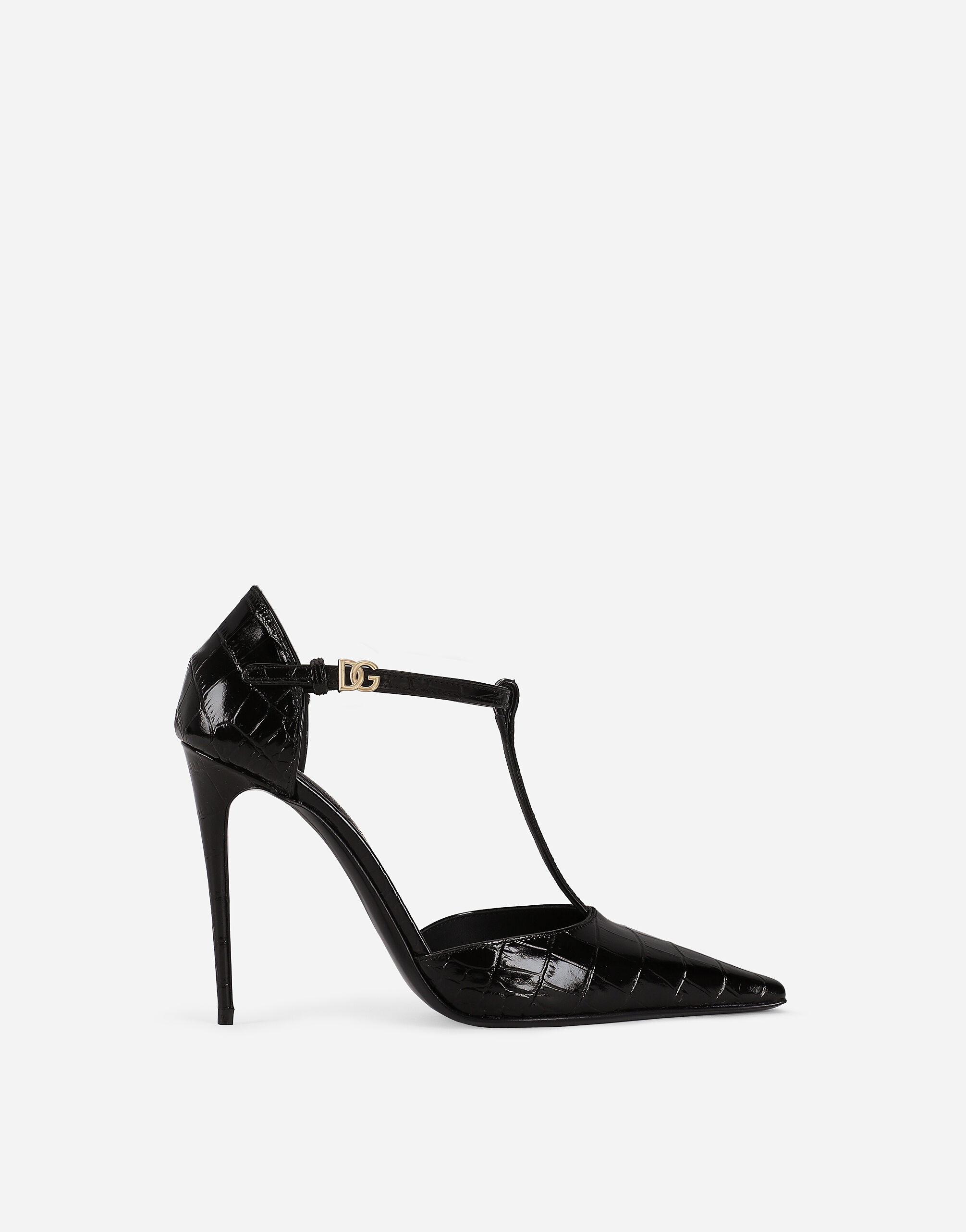 These new Mun T-bar pumps come in crocodile-print calfskin and feature the DG logo in light gold-plated metal. Crocodile-print calfskin T-bar pumps: • Black • 105-mm heel • Kidskin insole with branded label • Branded leather sole • Item comes with a branded dust bag • Made in Italy External composition: 100% Calfskin Internal composition: 100% Goatskin