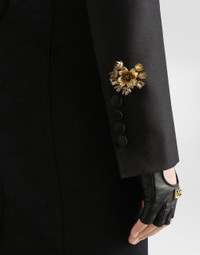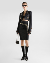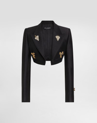 This single-breasted jacket in heavy faille is a symbol of timeless elegance, perfect for adding a touch of class to any outfit. Made with a refined wool and silk fabric, it represents the essence of Italian Tailoring. Single-breasted jacket in heavy faille: • Black • Spencer/Turlington shape • Melton undercollar • Left chest pocket • Faux pocket with double profiles • Classic long sleeves with buttonholes and buttons • Semi-structured and lined • The model is 175 cm tall and wears size 40 IT • Made in Italy External Composition: 86% Virgin Wool, 14% Silk