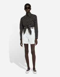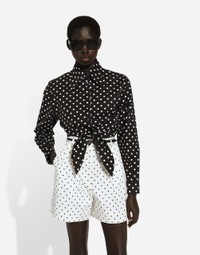 The FW24/25 Mambo Collection is rewriting the rules of Italian elegance, merging the sophisticated style of the 1940s and 1950s with the iconography of American pin-ups. The unmistakable polka-dot motif takes center stage, coming in a variety of shapes and sizes and adorning tulle, charmeuse, twill, silk and poplin, giving life to looks distinguished by black and white accessories and details. An homage to the beauty of Italy and its traditions, the distinctive details of Dolce&Gabbana’s creations. Cropped cotton poplin shirt with knot detail and polka-dot print: • Black and White • Shirt collar • Long sleeves • Cropped fit • Button fastenings and knotted waist • The piece measures 45 cm from the back of the neck on a size IT 40 • The model is 175 cm tall and wears a size IT 40 • Made in Italy The difference in the print placement that you may find on this product is a feature of Dolce&Gabbana’s “Handmade” pieces. A detail that makes every garment or accessory unique and exclusive. External composition: 97% Cotton 03% Spandex