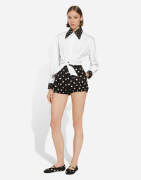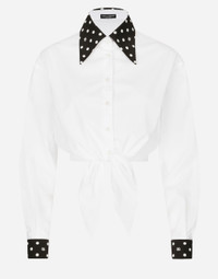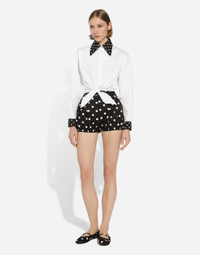 The FW24/25 Mambo Collection is rewriting the rules of Italian elegance, merging the sophisticated style of the 1940s and 1950s with the iconography of American pin-ups. The unmistakable polka-dot motif takes center stage, coming in a variety of shapes and sizes and adorning tulle, charmeuse, twill, silk and poplin, giving life to looks distinguished by black and white accessories and details. An homage to the beauty of Italy and its traditions, the distinctive details of Dolce&Gabbana’s creations. Cropped cotton poplin shirt with knot detail and polka-dot print: • White • Shirt collar • Long sleeves • Cropped fit • Button fastenings and knotted waist • The piece measures 45 cm from the back of the neck on a size IT 40 • The model is 175 cm tall and wears a size IT 40 • Made in Italy External composition: 100% Cotton