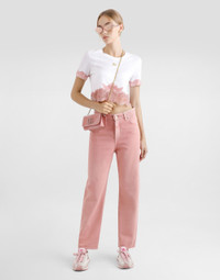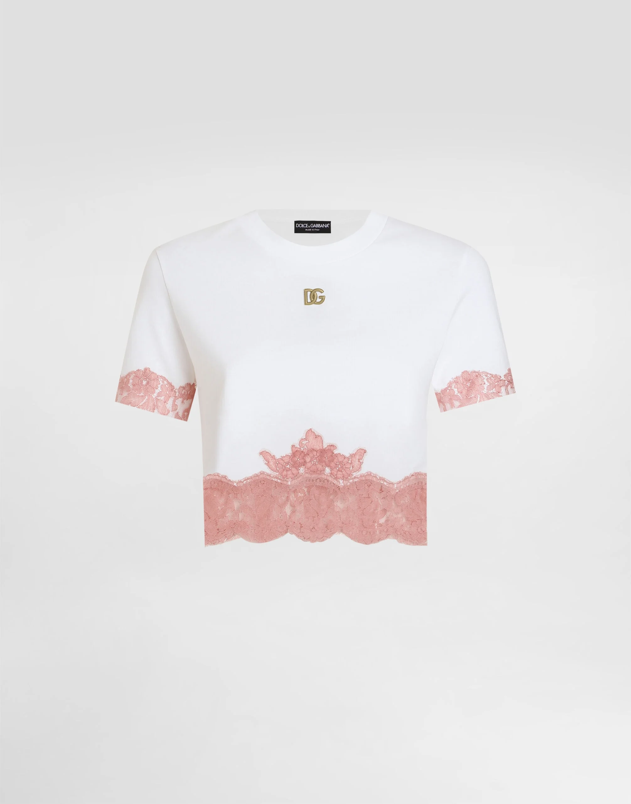 The Women’s DNA Collection is introducing a new side to femininity, which comes in shades of rose quartz, poised between sheerness and opacity, lightness and structure, formality and sensuality. Geometric Dolce Jackets, jacquard pajamas and floral brocade dresses intertwine with ultra-romantic designs. The DG print becomes an iconic statement, while Cordonetto lace and hints of Sicily Black embody the essence of a determined yet romantic femininity. Cropped cotton jersey T-shirt with contrasting lace inserts: • White • Round neckline • Short sleeves • Cropped fit • The piece measures 32 cm from the center back on a size IT 40 • The model is 175 cm tall and wears a size IT 40 • Made in Italy External composition: 80% Cotton 15% Polyamide 05% Viscose