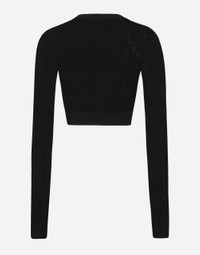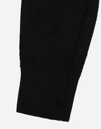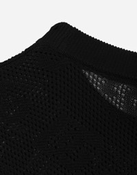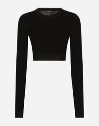 The DNA collection is distinguished by timeless shapes, bringing together three concepts: Sicilian flair, tailoring and sensuality. Nero Sicilia black and optical white predominate and pair with colors that catapult us onto the island of Sicily and make us dream. The designers channel the timeless wardrobe made up of creations that are instantly unmistakable in their simplicity, presenting us with sophisticated beauty loaded with meaning and symbolism that transcends fashion. Cropped mesh-stitch viscose sweater with all-over jacquard DG logo: • Black • 18 and 2 gauge • Round neck • Long sleeves • Dense hand • Ribbed neck, cuffs and hem • Slim fit • The piece measures 39 cm from the shoulder seam on a size IT 40 • The model is 175 cm tall and wears a size IT 40 • Made in Italy External composition: 83% Viscose 17% Polyester