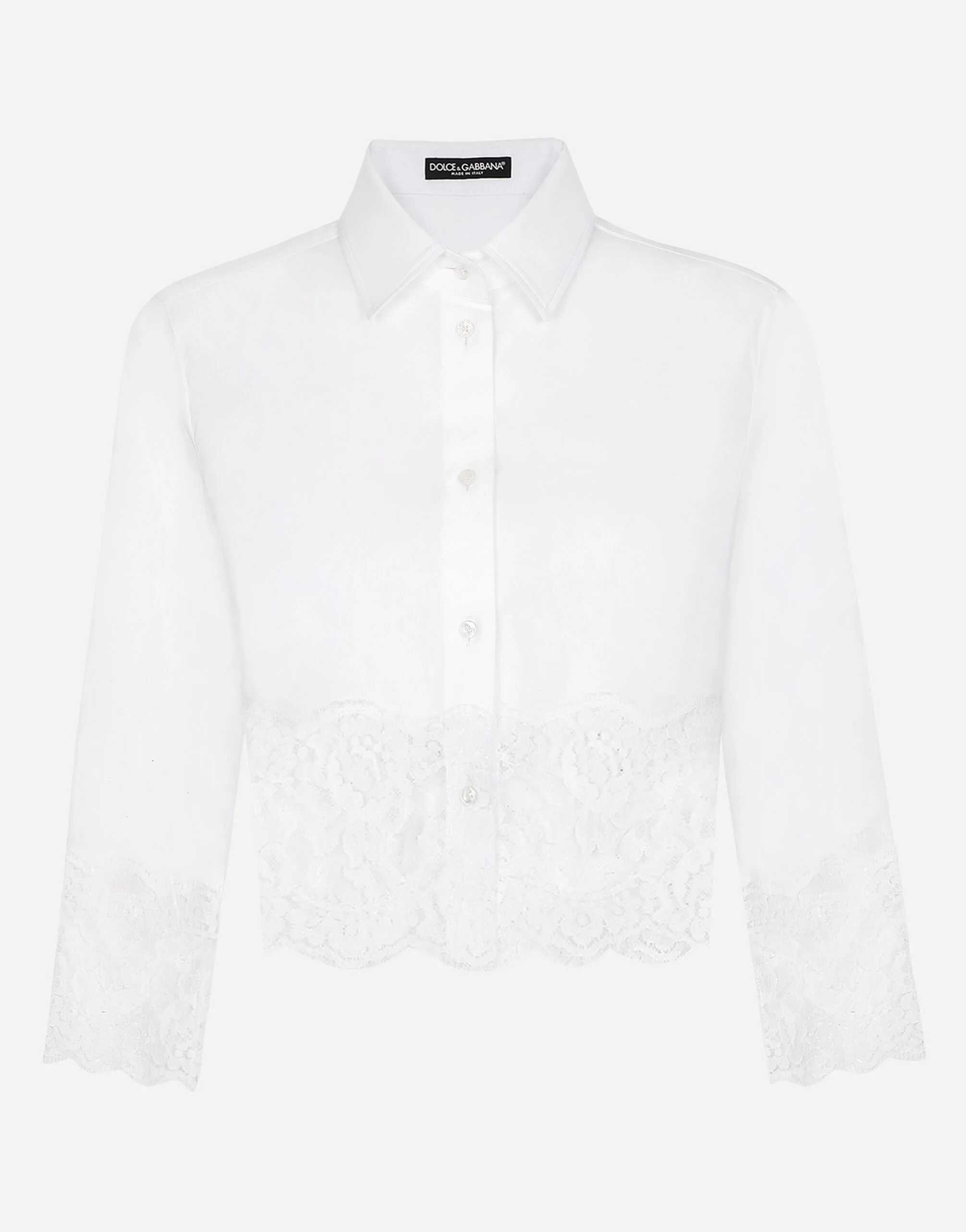 Cropped poplin shirt with lace inserts: • Shirt collar • 3/4 sleeves • Cropped fit • Tulle-lined lace • Button fastenings with branded bottom edge • The piece measures 46 cm from the rear collar seam on a size IT 40 • The model is 175 cm tall and wears a size IT 40 • Made in Italy Care And Details External composition: 94% Cotton 4% Polyamide 2% Spandex Internal composition: 100% Polyamide