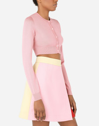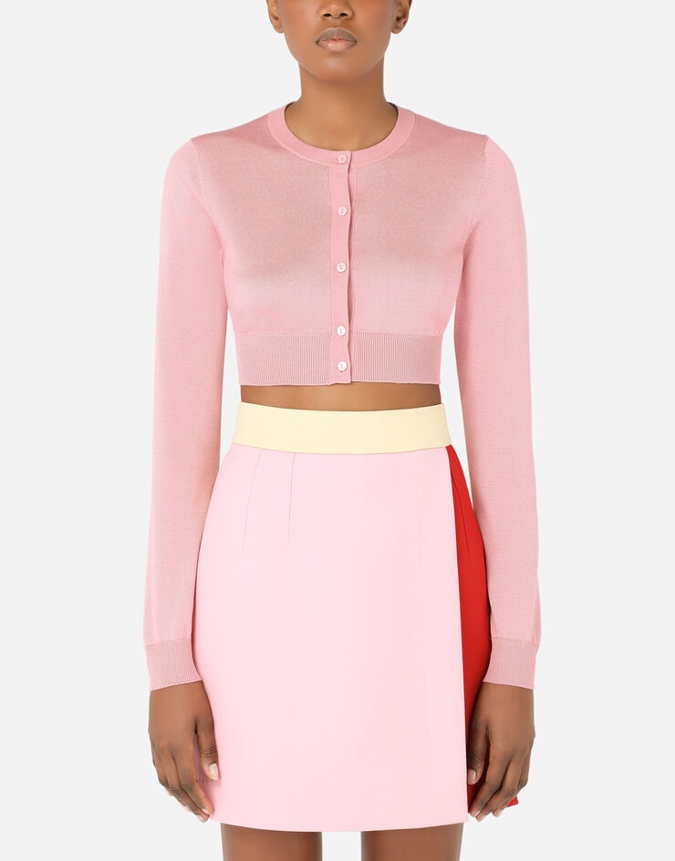 Seasonless minimal chic, this dusty pink micro-cardigan in fine silk will go with any outfit: • 14-gauge knit • Round neck • Long sleeves • Fitted cropped cut • Fine-rib trims • Mother-of-pearl button fastenings with branded bottom edge • The piece measures 35 cm - 13.8 inches from the collar seam on a size IT 40 • The model is 175 cm - 68.9 inches tall and wears a size IT 40 • Made in Italy Care And Details External composition: 100% Silk