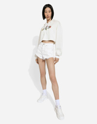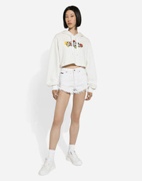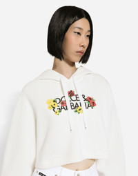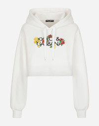 The spirit of the 1960s is taking over the new Flower Power collection. The focus is a head-to-toe floral look built around pairing and layering rose, anemone and floral bouquet maxi-prints. A cosmopolite poised between playful and sexy, this women interprets the austerity and elegance of the 1960s, harking back to boldly opulent imagery that here at Dolce&Gabbana is condensed and reinterpreted through silhouettes, ample proportions and airy shapes, bringing femininity and sensuality to the forefront. Cotton jersey hoodie with lettering and floral print: • White • Round neck with hood • Long sleeves • Ribbed neck and cuffs • Cropped fit • The piece measures 38 cm from the center back on a size IT 40 • The model is 175 cm tall and wears a size IT 40 • Made in Italy External composition: 100% Cotton