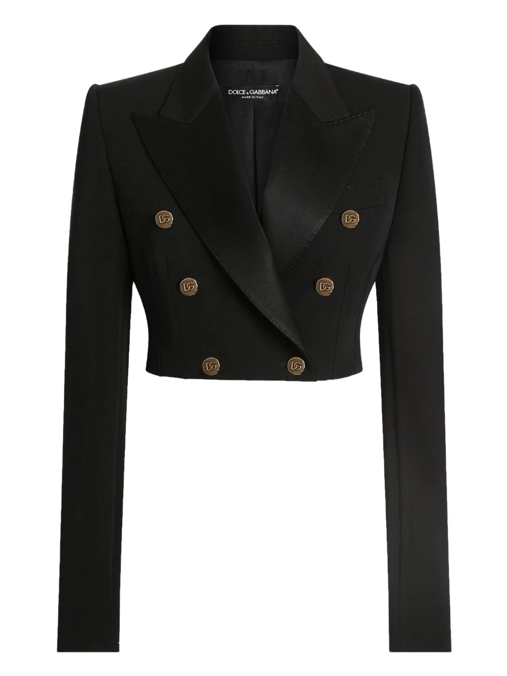 double-breasted buttoned jacket Highlights - Black - Double-breasted - Button fastening - Peaked lapels - Long sleeves - Cropped Made in Italy Composition Outer: Virgin Wool 85%, Silk 12%, Polyester 3% Lining: Silk 92%, Elastane 8% Washing instructions Read Manufacturer Guidelines