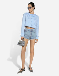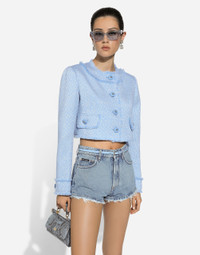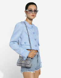 In the FW 24/25 DNA Collection, the rules of classic tailoring have been reworked with an innovative feel. New raschel weave techniques feature on micro-jackets and coats, and original textures are woven on trench coats, skirts, jacquard suits and shirts. The color palette made up of Nero Sicilia black, Milky White and Ocean Blue is also original. The iconic bags in fine nappa leather and “Pyton FC Machine” finish off the looks. Short raschel wool tweed jacket: • Light blue • Round neck • Long sleeves • Tonal stretch silk satin lining • Cannete-covered button fastenings and DG logo • The piece measures 40.5 cm from the rear collar seam on a size IT 40 • The model is 175 cm tall and wears a size IT 40 • Made in Italy External composition: 67% Virgin Wool 27% Viscose 06% Polyamide Internal composition: 92% Silk 08% Spandex