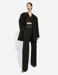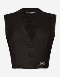 Cropped woolen gilet with the Re-Edition label: • Black • V-neck • Sleeveless • Cropped fit • Boning • Stretch silk satin lining on front and back • Covered buttons at the front • The piece measures 37 cm from the rear collar seam on a size IT 40 • The model is 175 cm tall and wears a size IT 40 • Made in Italy Care And Details External composition: 100% Virgin Wool Internal composition: 92% Silk 8% Spandex