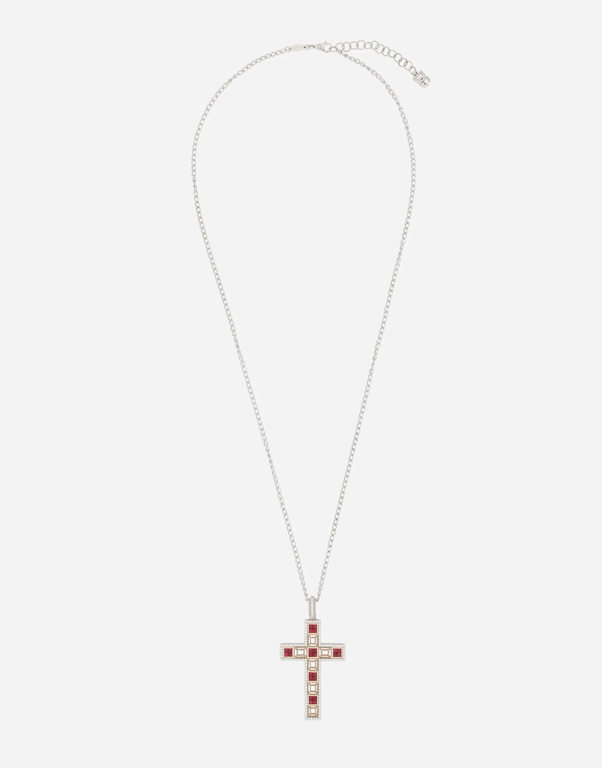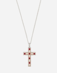 Cross pendant in white gold with rubies and diamonds. Technical features: 18 Kt red and white gold Length: 60 cm + 5 cm adjustable. Cross size: 4.5 cm Gems: 24 rubies (corundum variety): transparent, purplish red color, square shape, princess cut Made in Italy white gold