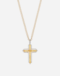 Yellow and white gold cross pendant with yellow sapphires and diamonds. Technical features: 18 Kt yellow and white gold Cross size: 5 cm Gems: 16 sapphires (variety corundum): transparent, yellow color, round shape, brilliant cut total weight: 3.29 ct 1 sapphire (variety corundum): transparent, yellow color, oval shape, mixed cut weight: 2.13 ct 116 diamonds: transparent, colorless, round shape, brilliant cut total weight: 0.72 ct clarity: VVS – VS color: D – G. Made in Italy yellow gold, white gold
