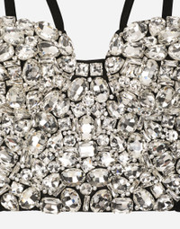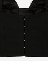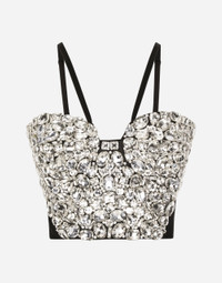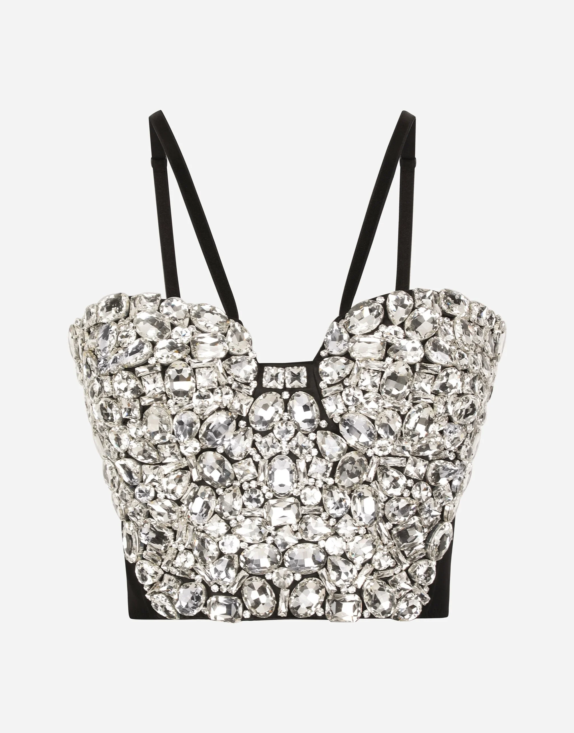 The SS23 fashion show retraces the history of Dolce&Gabbana from its origins, reinterpreting what it means to be Italian, its femininity and sensuality. It’s message is clear and strong: “fashion always looks forward, yet if it starts with a defined signature style it will never become obsolete”. The encounter with Kim Kardashian, the style and beauty icon of our modern times, has given life to an engaging and magical collaboration that led to the creation of a timeless collection that has been updated and reworked with an identity that speaks to the younger generations. Corset top with rhinestone embellishment on the front: • Silver • “Kim Dolce&Gabbana” inner label • The model is 175 cm tall and wears a size IT 40 • Made in Italy External composition: 50% Polyamide 38% Polyester 12% Spandex
