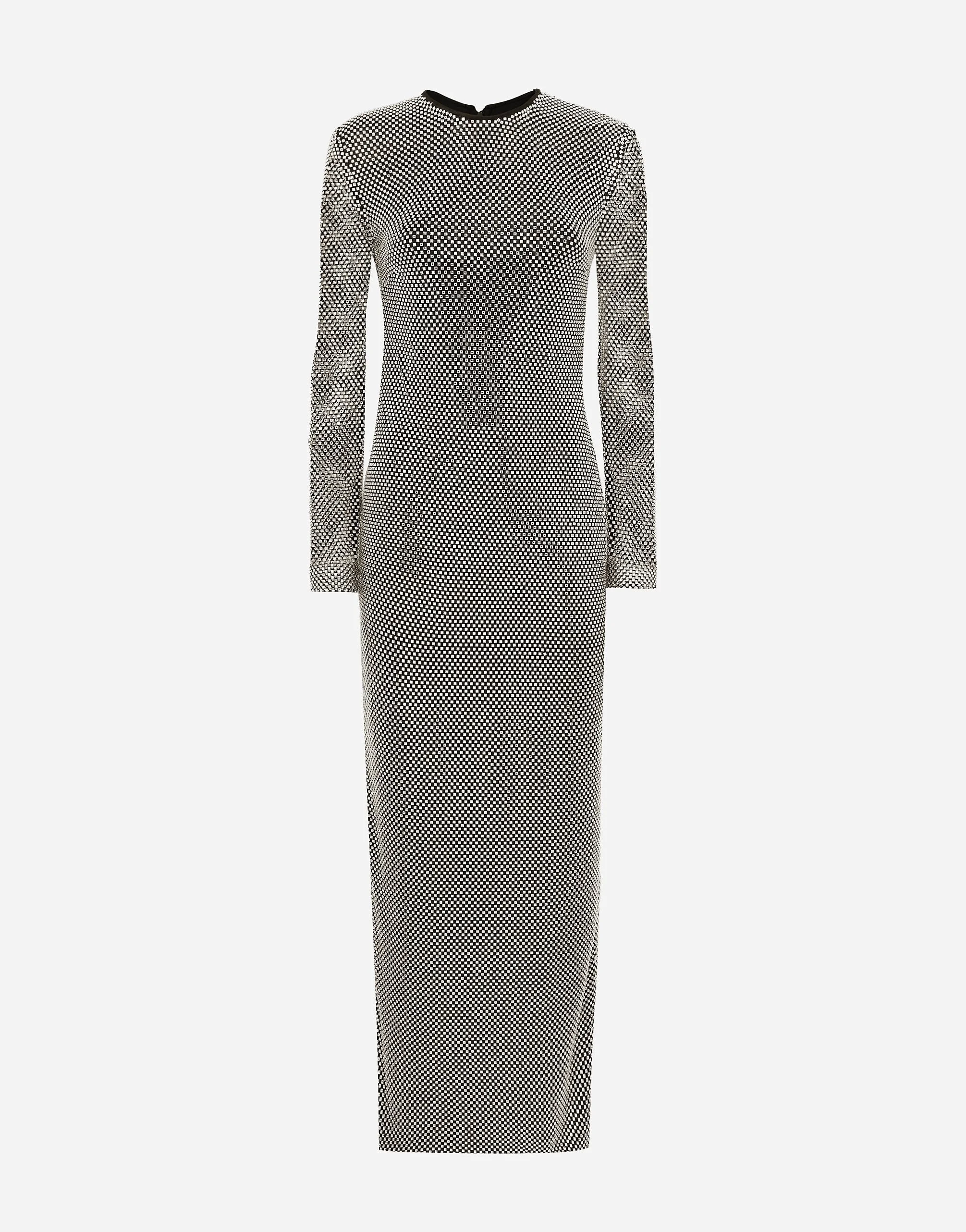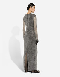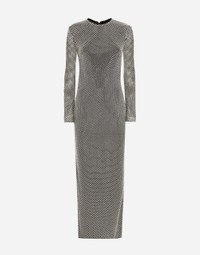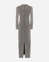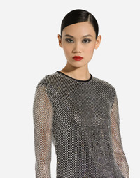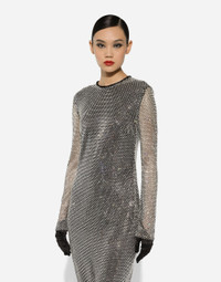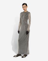 Menswear and womenswear mix and mingle, influencing one another and creating tailoring that embraces endless nuances, from the boldest to the most sophisticated, to define the rules of eternally classy femininity. A monochrome retelling in Nero Sicilia black, embellished by golden touches and rhinestones, adorning clean lines and incorporating stylish fabrics such as velvet, chiffon, lace, organza, and unique mesh details, the expression of authentic beauty for dresses, shirts and accessories. Long crystal mesh dress: • Silver • Round neck • Long sleeves • Stretch silk crepe de chine lining • Rear zipper and hook-and-bar fastening • The piece measures 108 cm from the waist down on a size IT 40 • The model is 175 cm tall and wears a size IT 40 • Made in Italy External composition: 95% Polyester 05% Silk Internal composition: 91% Silk 09% Spandex