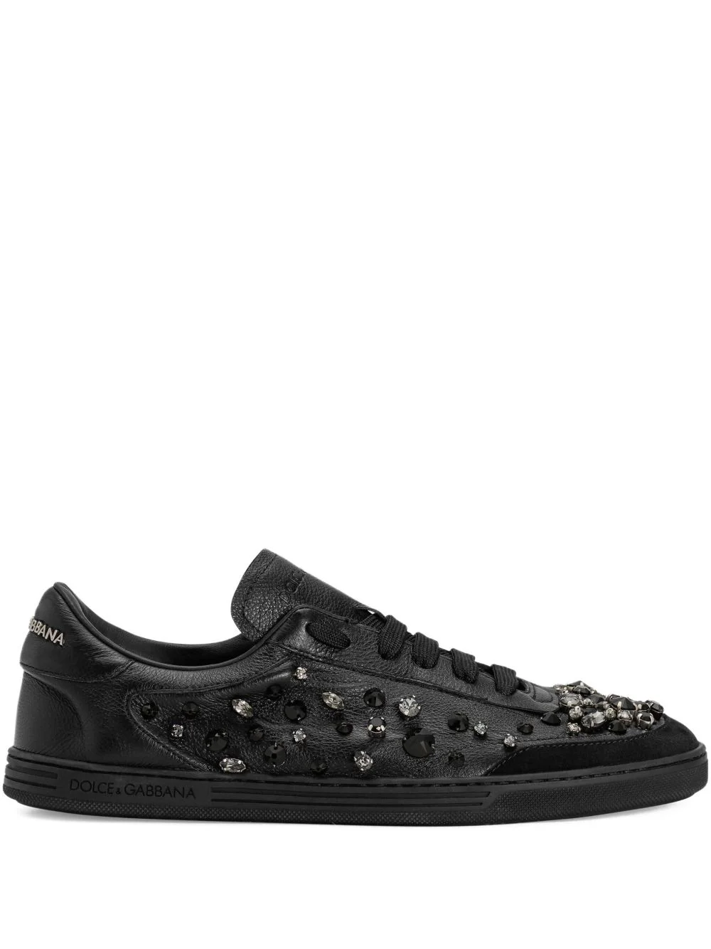 crystal-embellished leather sneakers Highlights - Black - Leather - Crystal embellishments - Lace-up fastening - Suede panel - Rubber sole Made in Italy Composition Outer: CALFSKIN 100% Sole: Rubber 100% Lining: Lambskin 90%, Goat Skin 10%