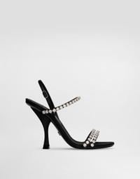 In the Fall/Winter 2025 Fashion Show Collection, shearling jackets, in fur-free versions, reveal slip dresses and create contrast' plays while denim welcomes fabric or Leo print inserts. Sweatshirts are the result of long experimentation with volumes. Evening looks become precious thanks to dresses with special embroideries and luminous touches of sequins and crystals. Sheepskin inserts also unite hats, shoes, and bags, including those with pockets. This sandal represents the elegance and sophistication of contemporary design, combining fine materials and unique details for a sophisticated and fashionable look. Satin sandals with rhinestone chain: • Multi-colored • Keira 2.0 shape • Leather outsole with metal DG detail • Open toe insole in leather • Insole customization with label • With embroidery with stones • Customization with DG crossed logo • Miami palladium plating • Item equipped with a black Cotton bag and a black embossed box • Heel height 105 mm • Made in Italy External Composition: 74% Viscose, 25% Silk, 1% Lambskin Internal Composition: 68% Goatskin, 23% Viscose, 9% Silk