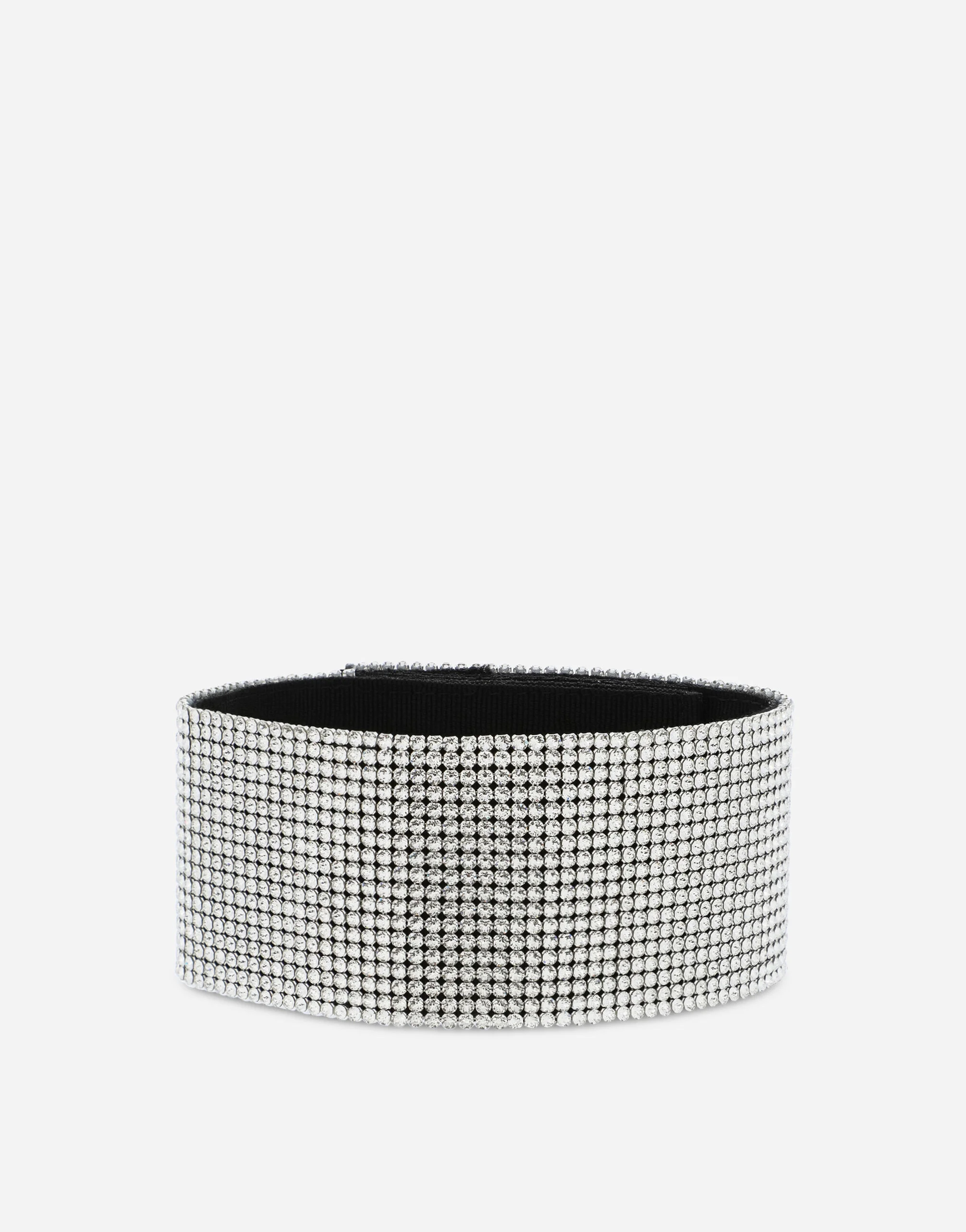 Crystal mesh choker: • Appliqué on gros-grain • Glass crystal rhinestones • Adjustable hook-and-loop fastening and metal aglets • Height: 5 cm • Nickel-free and hypoallergenic materials • Made in Italy Care And Details Composition: 30% Cotton 25% Glass 10% Brass 10% Copper 10% Acetate 10% Polyamide 5% Zinc