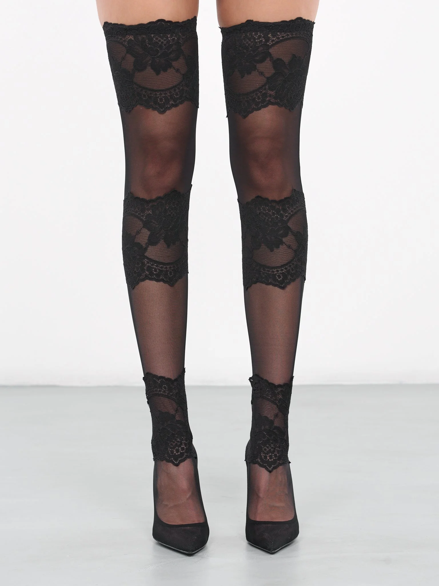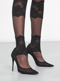 DOLCE & GABBANA black shoes, boot pumps design, stretch tulle, lace inserts, thigh-high, pointed toe, kidskin insole, branded label, fitted. Made in Italy External - 76% Polyamide, 15% Spandex, 9% Viscose Internal - 47% Goatskin, 38% Polyamide, 15% Viscose Hell - 4.1"