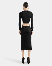 The Spring/Summer 2025 Women’s Collection is celebrating Italian beauty through bold and charismatic femininity. The 50s-inspired lingerie is the star, intermingling with fitted dresses, corsets and oversize trench coats. The iconic jackets have been updated with cropped cuts and modern inserts, while the floral prints add a romantic edge. The eveningwear shines with light fabrics and crystals, accompanied by look-defining accessories, from iconic bags to the cross earrings. Cropped viscose sweater with stitch work: • Black • 18-gauge knit • Round neck • Long sleeves • Ribbed trim • Raglan cuts • Slim fit • The piece measures 42 cm from the shoulder seam on a size IT 40 • The model is 175 cm tall and wears a size IT 40 • Made in Italy External composition: 79% Viscose 13% Polyamide 8% Polyester