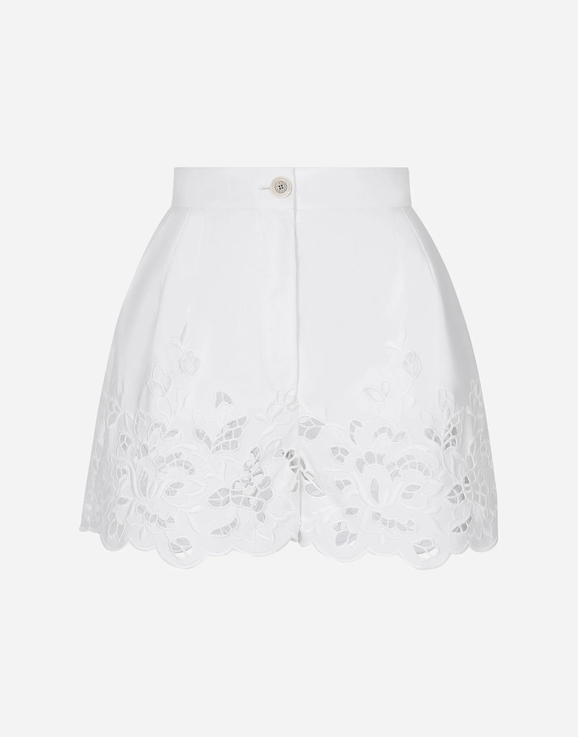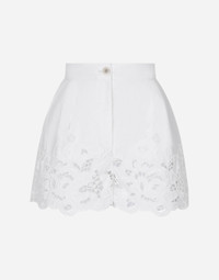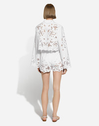 The Italian summers of the 1960s, the candid purity of white, the sophisticated elegance of the jet set of that era. The imagery of the FW24/25 Capri Collection encapsulates all this flawlessly. The pieces range from floaty poplin silhouettes or sack-style dresses and skirts, to brocade outerwear and floral-inlay fabric shirts. The iconic bags – the Logo Bag, the Sicily Bag and the Dolce Box – complement the looks, while the shoes come embroidered with designs inspired by the crystal-clear sea of Capri. Cotton poplin shorts with cut-out detailing: • White • High-waisted • Slant front pockets • Inner leg: 6.7 cm • Hem: 34.2 cm • Zipper and button fastening • The model is 175 cm tall and wears a size IT 40 • Made in Italy External composition: 95% Cotton 05% Polyester